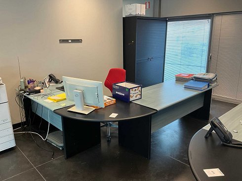 Consiste en 1x tamaño de escritorio en forma de L de 230x270x72 cm con silla de oficina y unidad de cajones, + 1x armario con puerta enrollable de 45x120x200 cm con contenido excluyendo documentos confidenciales, 1x pantalla Fujitsu con teclado y ratón, radio y teléfono, etc. |