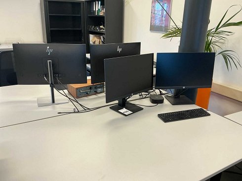 4 monitores HP variados, que consisten en 2 E27q, 2 P24h, incluyendo dock USB-C y teclados. Incluye 1x radio sangean |