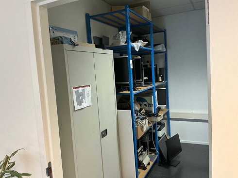 Archivador 89x43x195cm, 1 mesa de 160x80cm, silla, estanterías con varios periféricos (incluyendo monitores, teclados, etc.) |