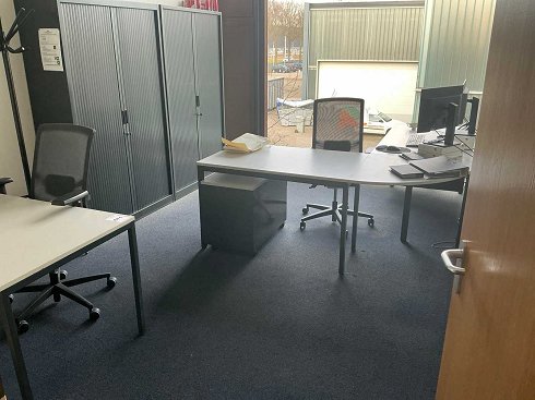 El lote consta de un escritorio de 200x240cm, 1 mesa de 160x80cm, 2 sillas de oficina, 1 perchero, 2 archivadores de 120x43x195cm, 2 monitores HP P24f con estación de acoplamiento USB-C, teclado y ratón.