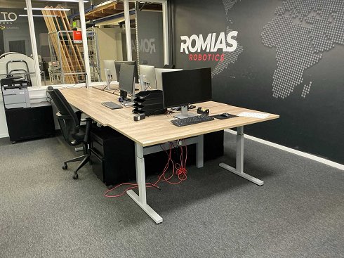 2 escritorios eléctricos ajustables en altura (marco enlazado), 3 escritorios estándar (de los cuales 2 montados en la pared) equipados con regleta emergente integrada Brennenstuhl. Incluye 3 sillas de oficina y 2 cajones móviles de acero. Hardware no incluido. El comprador debe desmontar los escritorios él mismo. |
