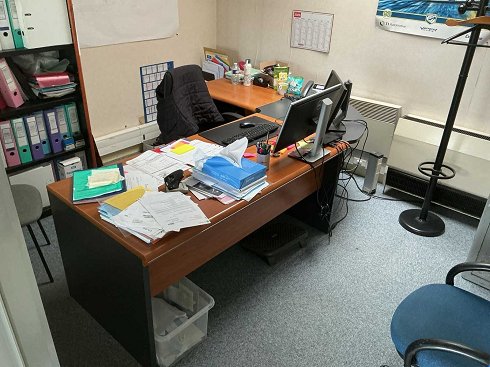Incluyendo: dos sillas, un armario corredera con puerta (121x45x195cm), un escritorio en forma de L (250x170x74cm), un pedestal móvil. Vendido sin contenido |