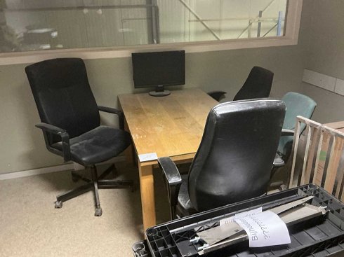 Consiste en un escritorio de madera con cubierta de cristal, con unas dimensiones aproximadas de 140 x 85 x 76 cm y una silla de oficina 4x. Tumbado sobre la cubierta. Bajando el cobre de forma independiente. |