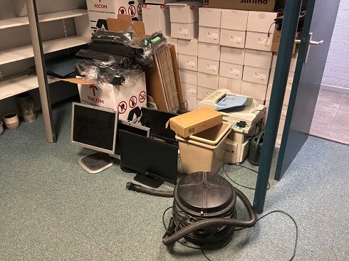 Estos incluyen: monitores, 1 aspiradora Electrolux, 1 impresora láser, calculadoras, blocs de escritura (impresos), carpetas,