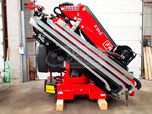 Grúa hidráulica F345RB.2.26 xe-dynamic de dos bielas, con seis extensiones hidráulicas y alcance de 16,55 m (26.55 m con jib) y carga en punta de 1.480 kg. (410 en la punta del jib) Con radiomando Scanreco de 8 funciones. La grúa incorpora además sistema PROLINK (que permite aumentar el ángulo de trabajo sobre la línea horizontal en 10-15º), distribuidor D900, dispositivo XP (reserva de potencia), dispositivo ADC (control de la dinámica) y válvula regeneradora de aceite. Incluye juego de estabilizadores super extra extensibles hidráulicos a 6.650 mm. Cuenta con el brazo secundario y las prolongas decagonales.