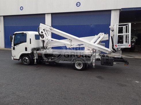 Disponible a la venta esta plataforma aérea de 20 m, Multitel HX200EX montada sobre camión ISUZU. La plataforma está fabricada completamente de aluminio, excepto la torreta, o sea que es una plataforma super ligera. Conjunto entero montado y legalizado. La plataforma tiene una altura de trabajo de 19,9, alcance lateral de 9,60 m, cesta de aluminio para dos personas (carga 225 Kg), con toma eléctrica a 230 v. para conexión de herramientas de mano, giro independiente de la cesta de 65º izq/dcha, y arranque y parada del motor del vehículo también desde la cesta.