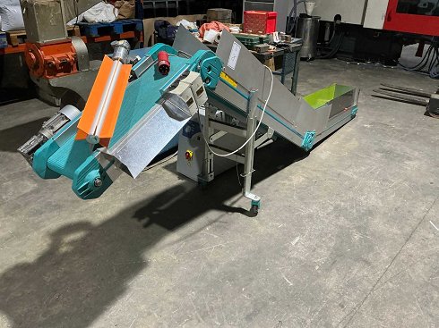 Cinta transportadora inclinada con cinta modular de plástico para transportar piezas desde máquinas hasta contenedores o procesos posteriores.
