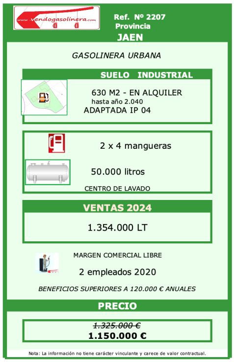 | Detalles | ( Gran población provincia de Jaén ) Gasolinera urbana en suelo industrial de 630 m2 en alquiler hasta 2040. Adaptada IP04. Surtidores/mangueras = 2 X 4 = 4 calles Depósitos Capacidad toal = 50000 Lt. Margen comercial libre + Centro de lavado. 2 empleados 2020. Ventas anuales aprox. 1.650.000 litros x 12 céntimos de media. MUY RENTABLE |