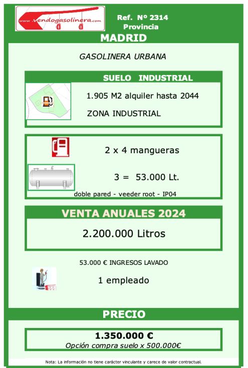 | Detalles | ( Gran población en cinturón de Madrid capital ) Zona estratégica gran afluencia. Gasolinera Urbana en suelo industrtial de 1905 m2 en zona industrial. De propiedad. Surtidores/mangueras = 2 x 4 = 2 calles, 4 puntos de repostaje. Depósitos = 3 = 53.000 L. Doble pared - veedr root - IP04. Gran centro de lavado. 4 boxes + aspiradores. 1 empleado sin antigúedad. Ventas Oil 2024 2.200.000 Lt con buen margen comercial. Ingresos de 55.000EUR en lavados. SE vende sólo la gasolinera y lavadero por 1.350.000 EUR y quedarse el suelo en alquiler durantes 25 años. Se puede comprar el terreno por 500.000 EUR Negocio rentable Madrid. |