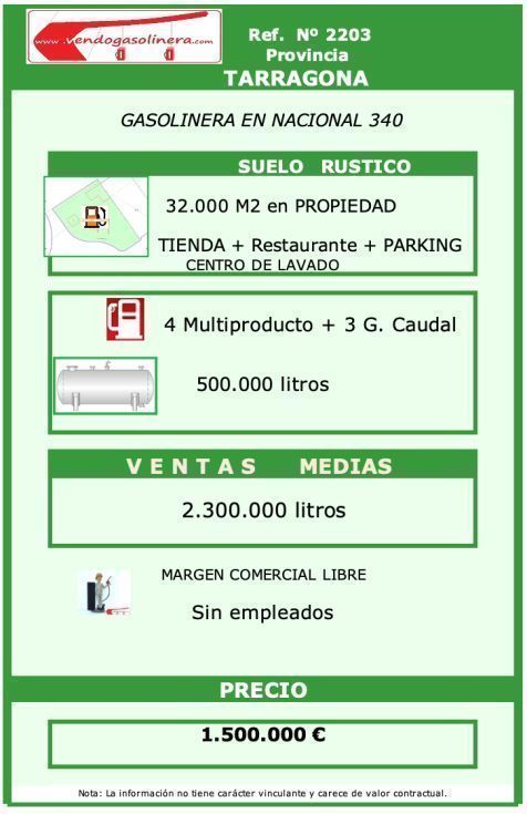 | Detalles | ( Población Provincia de Tarragona ) Gasolinera en Nacional 340 en suelo rústico de 32000 m2 en propiedad. Tienda + restaurante + parking + centro de lavado. Surtidores/mangueras. = 4 x 8 + 3 x 1 Gran Caudal. Depósitos = Total capacidad 500.000 L. Margen comercial libre. Sin empleados. GRAN ÁREA DE SERVICIO |