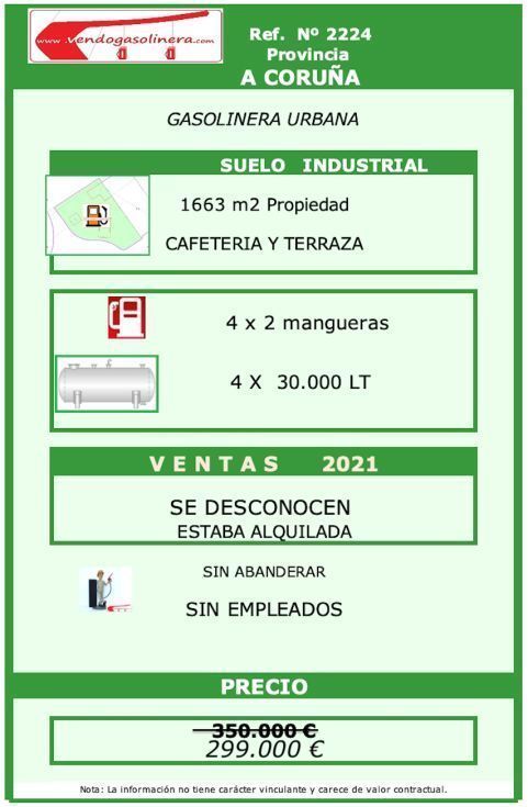 | Detalles | Estación de Servicio a pie de carretera entre grandes poblaciónes de la provincia de A Coruña. Zona Norte. Dispone además de una cafetería montada para funcionar. Terreno en propiedad, En este momento la gasolinera ESTA CERRADA por jubilación. IDEAL para AUTOEMPLEO. Precio Negociable. |