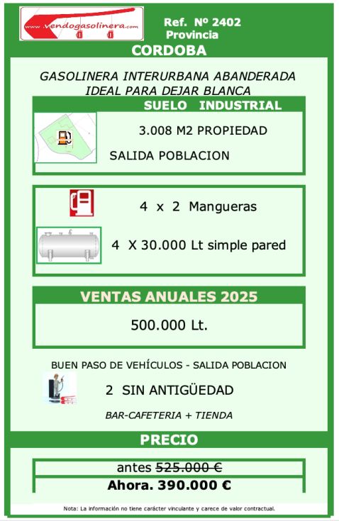 | Detalles | Estación de servicio tradicional abanderada entre 2 poblaciones grandes de la provincia de Córdoba. 3.000 m2 en propiedad + bar cafetería. Buen paso de vehículos entre poblaciones. IDEAL para dejar sin bandera, ya que no le aporta ningún beneficio. Comprando en el mercado libre podría mejorar precios y subir margen comercial. Ventas de 2025 - 500.000 Litros PVP 390.000 EUR por el suelo, las instalaciones, y fondo de comercio. |