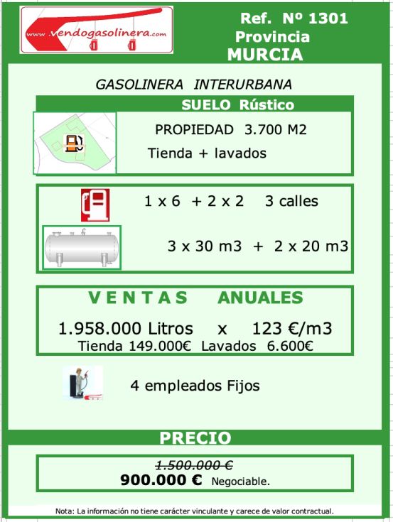 | Detalles | Estación de servicio tradicional con tienda y centro de lavado. Se vende también la parcelas de 3.700 m2 a pie de carretera. Sin Abanderar para comprar a mejor postor. Ventas de casi 2.000.000 de litros al año Ingresos de + de 140.000 en tienda. Ventas muy regulares durante años.