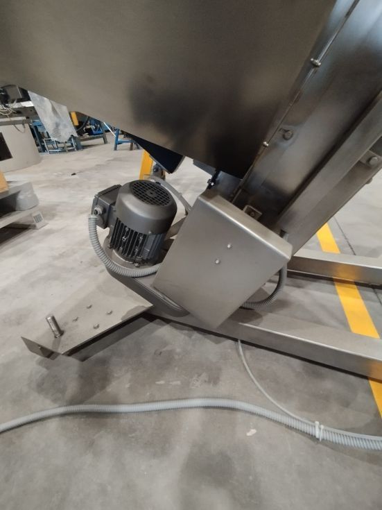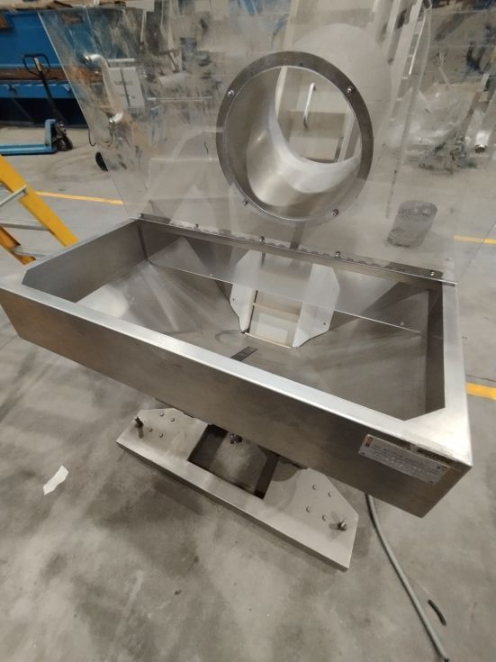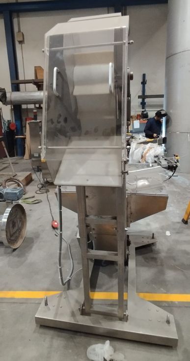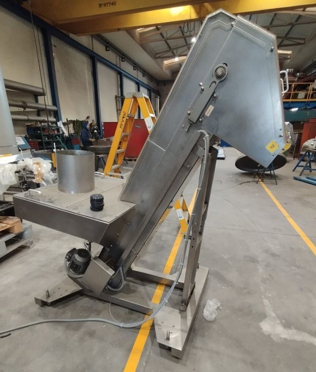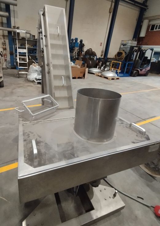 | Detalles | Elevador de tapones - jirafa. Construido en inoxidable. Tova de recepción y almacenamiento de tapones u otros productos con vibrador. Altura de salida de 125cm. Montado sobre estructura en inoxidable con ruedas. En perfecto estado. |