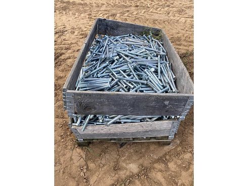 Lote a granel de pernos de cabeza hexagonal de acero galvanizado almacenados en una caja de madera. |