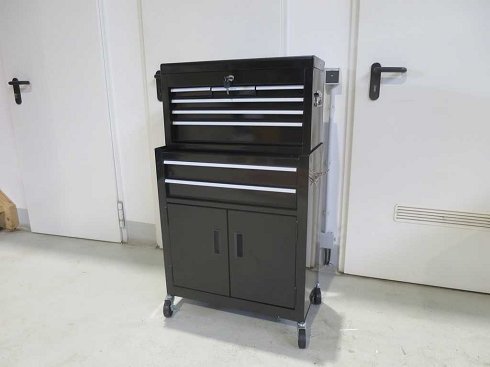 Carro de herramientas con caja superior extraíble. Cajones con cojinetes de bolas (doble almacenamiento) Alfombrilla antideslizante en cada compartimento. 2 varillas de acero para bloquear la caja superior. Todos los cajones se pueden abrir al 100%. Mangos macizos, 4 ruedas de 70 mm, 2 llaves. Número de cajones 8 uds. Peso neto 27 kg Dimensiones L-W-H 700 x 400 x 750 mm Condición: nunca usado / nuevo (5) |