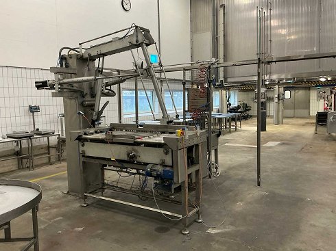 3 ejes, longitud de brazo 2800 mm, equipada con cinta transportadora de entrada, longitud 2000 mm y cinta transportadora de rodillos de flujo