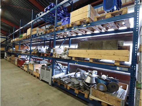 Y accesorios, incluyendo transportadores, cadena transportadora, motor, contenedores, ventiladores, moldes de bandeja, material de instalación, etc., de 10 secciones en estantería y en el suelo detrás de la valla |
