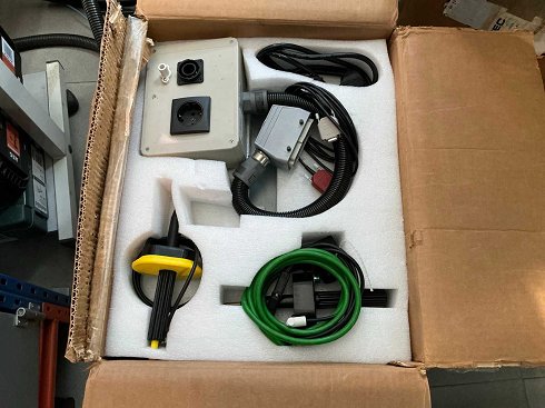 El lote incluye la unidad principal de pruebas con botones de pantalla y control, caja de conexión, sondas de prueba y cables de interconexión almacenados en la caja original forrada de espuma.