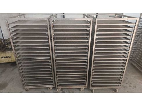 Carritos de secado de acero inoxidable con 20 estanterías equipadas con bandejas + 12 bandejas de acero sueltas.
