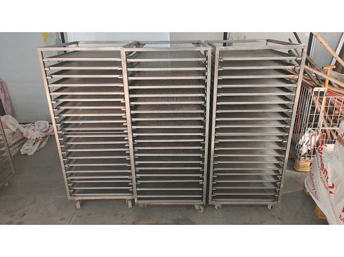 Carritos de secado de acero inoxidable con 20 estanterías equipadas con bandejas + 12 bandejas de acero sueltas.