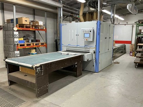 Grosor de la pieza: 3 - 160 mm, 3 unidades de mecanizado: 1ª banda transversal, 2ª banda longitudinal, 3ª banda longitudinal. Con cinta transportadora de rodillos aproximadamente 4900 x 1600 mm (ancho de rodillo: aprox. 1400 mm), cinta transportadora de suministro VENJAKOB aproximadamente 2600 x 1500 mm (ancho de cinta: aprox. 1300 mm) |