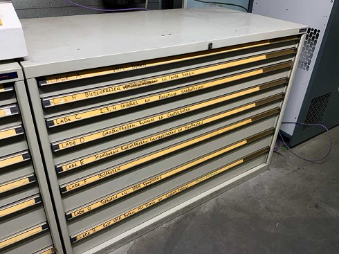 Cajonera equipada con 8 cajones cuyo contenido consiste en varios taladros, molinos, |