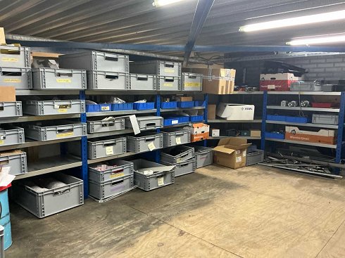 Varias piezas de máquina, cables, cilindros Festo, etc. El almacén está situado en un andén bajo con una escalera estrecha. El comprador debe dejar el almacén (sin estantes) vacío. |