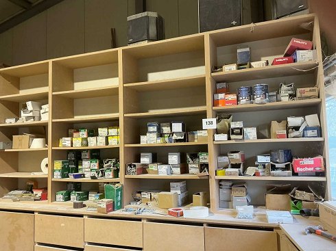 Incluyendo a Spax, Wurth, Berner, JetFast, ... Compuesto por: lote de varios tornillos, incluyendo principalmente tornillos de madera, remaches de parpadeo, clavos de tiro, anclajes de hormigón, algo de masilla para madera, clavos, algunas plantillas de fresado de MDF, 3 cuadrados, distribuidos según las instrucciones, excepto el armario de almacenamiento