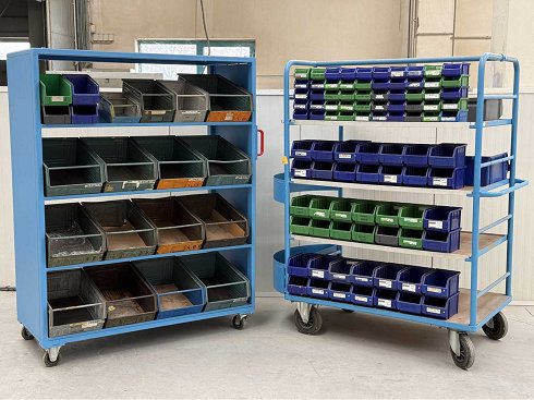 Carro de materiales equipado con cajas metálicas y carro de estantería equipado con cajas de plástico, dimensiones: 1600x800x1800 y 1450x650x1800