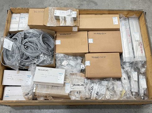 1 paleta de piezas Festo no utilizadas: válvulas de control de presión proporcional, reguladores de filtro, cilindros compactos, cilindros estándar, cables de conexión, etc.; Para más detalles, véanse las fotos de las placas con el nombre |
