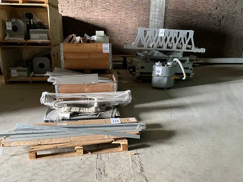 Compuesto por tiras de acero, componentes de aire comprimido, piezas de marco de aluminio, bomba de diafragma, elementos calefactores, lámina, piezas de máquina, aspiradora, etc., en 9 paletes |