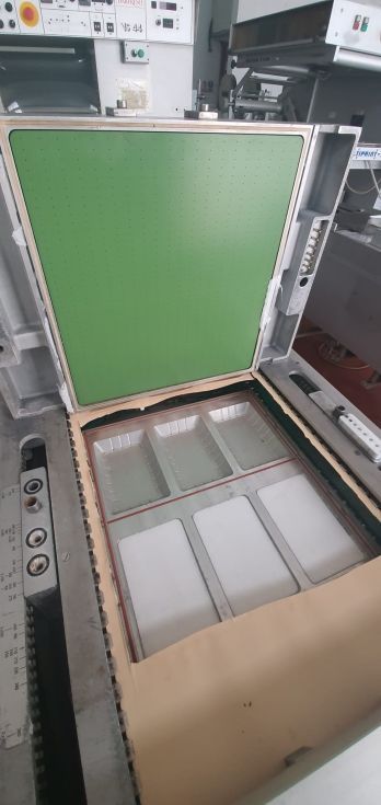| Details | TERMOFORMADORA Máquina para formar bandejas Marca: CRYOVAC Modelo: VS 44 MD Código: MULTY 9031 Esta máquina realiza un proceso de trasformación de plástico que lleva una lámina de plástico que es calentada y que toma la forma del molde sobre el que se coloca. El termoformado puede llevarse a cabo por medio de vacío, presión y temperatura. Ficha Técnica: Medidas exteriores (mm): Alto: 1880 Ancho: 6800 Fondo: 1200 Funcionamiento: eléctrico Tensión (V): 380 Potencia (Kw): 21 Frecuencia (Hz): 50 Presión neumática (Bar): 6 Bomba 400 m3/h