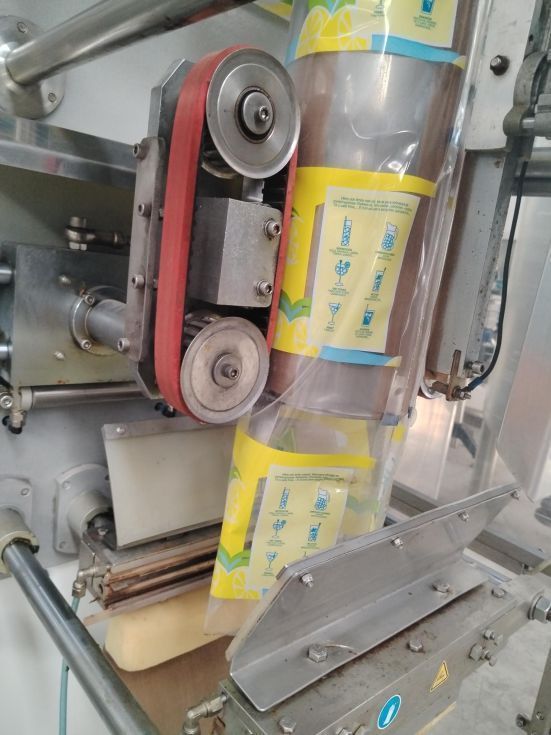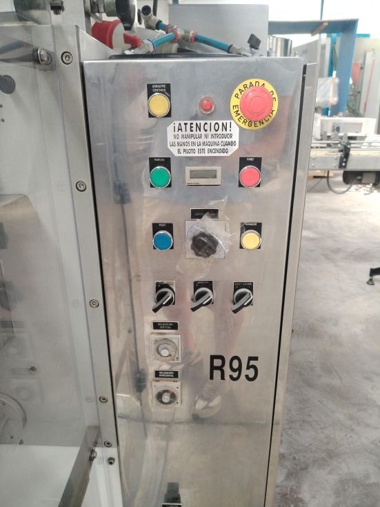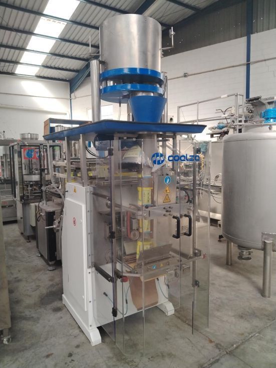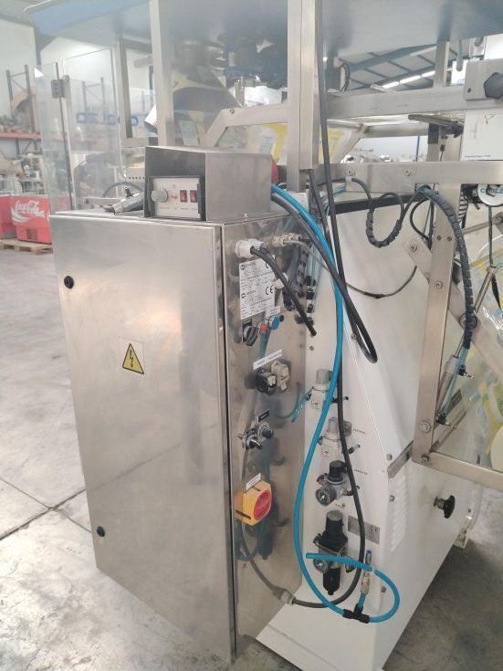 Envasadora de bolsas con codificador instalado en 2019. Partiendo de una única bobina y un único dosificador volumétrico de vasos tipo carrete para producto granulado. Es una máquina versátil, lo que hace que sea un modelo muy apreciado por los clientes que necesitan cubrir un amplio abanico de posibilidades. Es una envasadora vertical universal y experimentada en industrias muy dispares tales como detergentes en polvo, cafés, chocolates, leche en polvo, quesos, productos fitosanitarios, salsas, mayonesas, etc. Es una máquina de accionamiento electromecánico que le confiere una base sólida y firme, capaz de obtener un buen rendimiento en las condiciones más duras de trabajo. Un motor y un convertidor de frecuencia permiten alcanzar producciones elevadas para cada una de las dosis con que tenga que trabajar.
