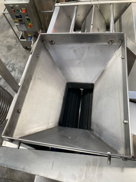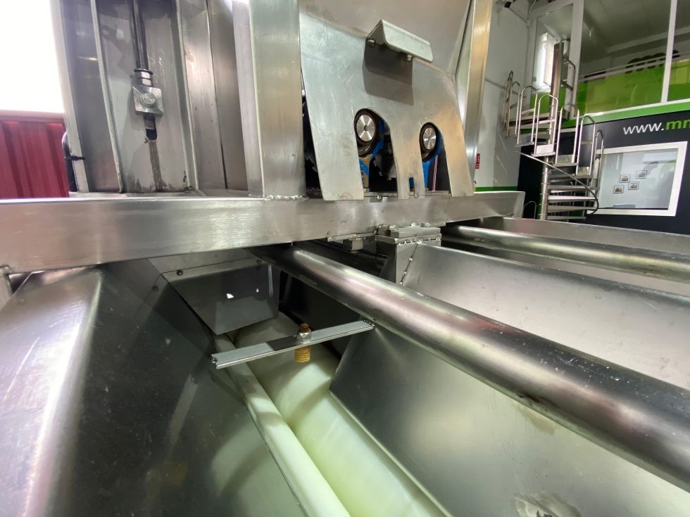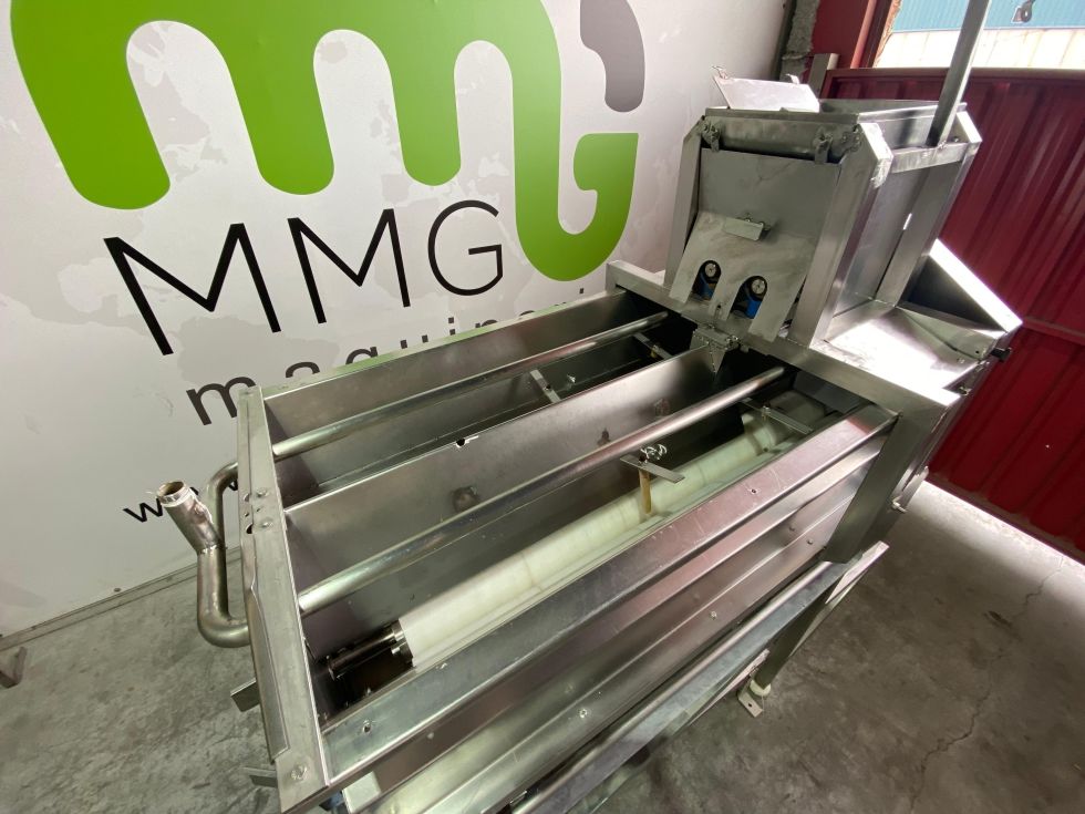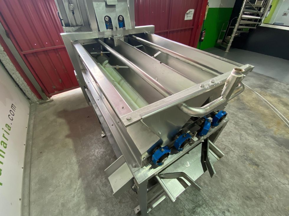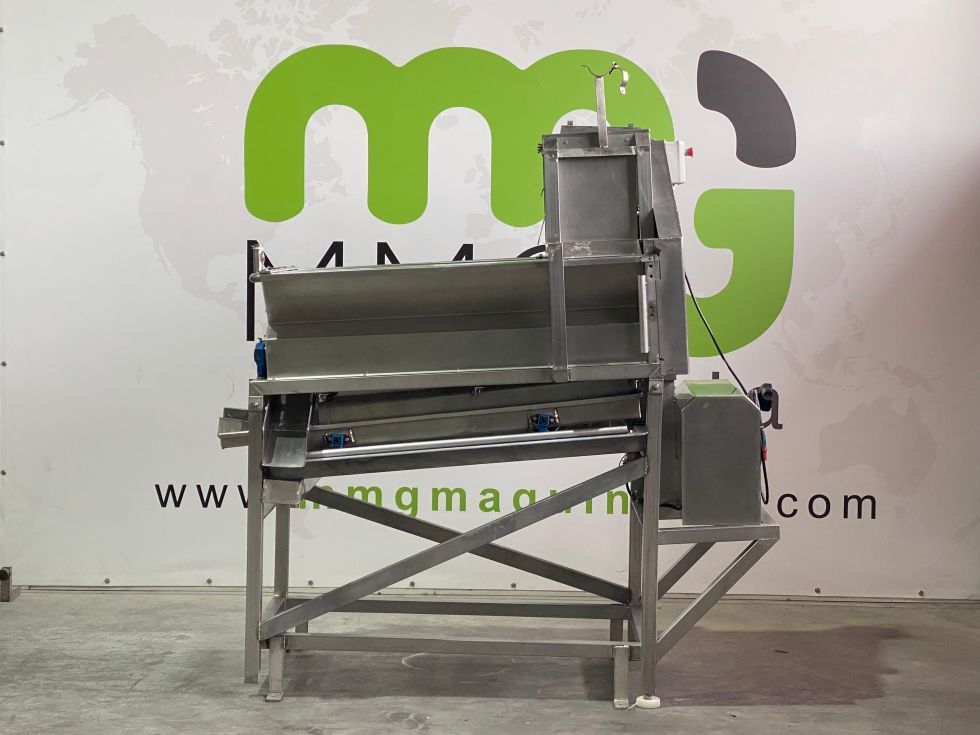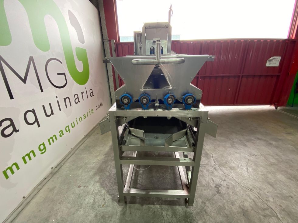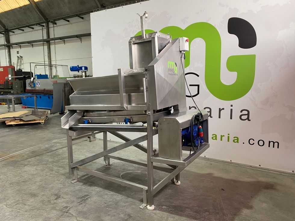 Equipo de acero inoxidable preparado para el tratamiento de mazorcas de maiz, la deshojadora automática de maíz recibe maíz de tolvas, cintas transportadoras y dosifica, esparce, alinea, filas individuales y deshoja mazorcas o maíz.