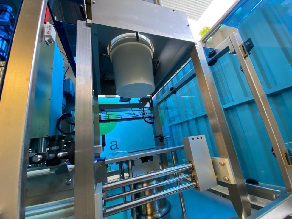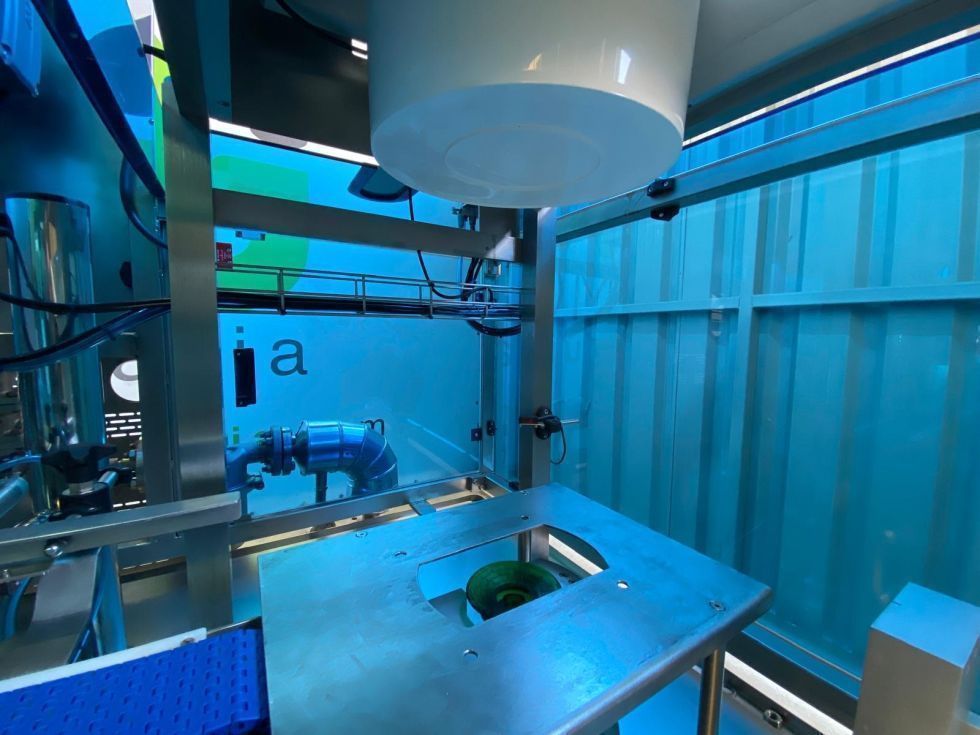 Todos los módulos de la línea están unidos y sincronizados mediante un transportador de movimiento continuo, transportando los envases por el sistema de apoyo a las distintas estaciones de trabajo. La velocidad del transportador tiene la posibilidad de ser graduada mediante un variador de frecuencia.