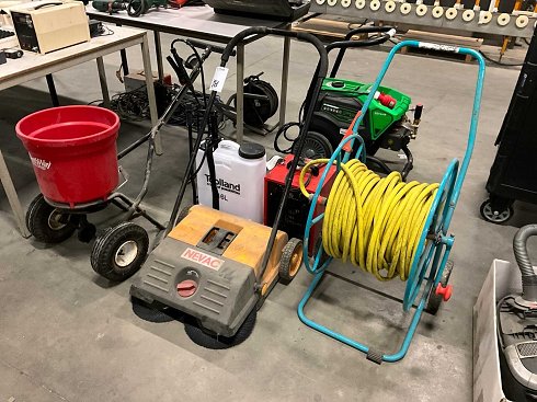 Barrendera, calefactor, esparcidor de sal, rociador de mochila y carrete de manguera