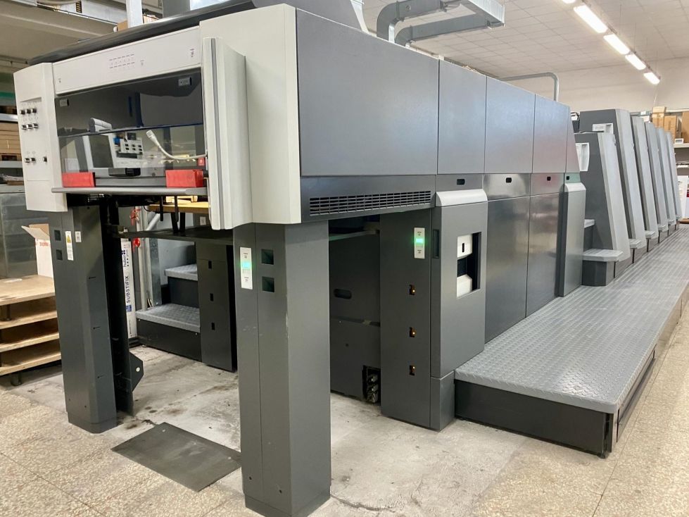 | Detalles | torre de barniz (racleta de cámera) CP2000 Consola de Control con telemando para zonas de entintado, velocidad de los rodillos del tintero, los registros circunferencial, lateral y diagonal, con Job Memory Card y pantalla táctil ALCOLOR Vario grupo mojador con circulación y refrigeración AUTOPLATE sistema automático de cambio de planchas PRESET ajuste automático al formato del pliego dispositivo de lavado automático de los rodillos entintadores dispositivo de lavado automático de la mantilla y cilindro impresor 5 x UV interdeck secadores 1 x UV secador final con 2 lámperas 1 x IR secador y aire caliente pulverizador salida de pila alta y prolongada accesorios standard (excelente oportunidad - como nueva) |