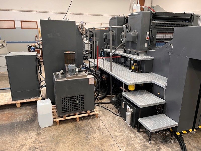 | Detalles | Medidas: 72 x 102cm, Placa de acero sobre alimentador y salida con rampa (para pallets de plástico o madera), Alimentador de chorro con cinta, Detección electrónica de doble hoja, Detección electromecánica de doble hoja, Control electrónico de tendido lateral, fotoelectrónico y acústico, Encendido antiestático alimentador y entrega, sistema de humedecimiento continuo Alcolor con dosificación de alcohol; sistema de unidad de enfriamiento y recirculación, ajuste automático de espesor, alimentador y entrega preestablecidos, CP-Tronic, control y diagnóstico de la máquina CPC 1.04 mediante consola de monitor de plasma/autodiagnóstico, consola de control y monitor; entintado remoto; humectación; control de registro axial, circunferencial y diagonal con lápiz óptico; iluminador de luz natural y tarjeta de memoria para memorias de trabajo), Lavado automático de cilindros de mantilla programable mediante CP-Tronic, Lavado automático de rodillos programable mediante CP-Tronic, Autoplate (cargador de planchas semiautomático) con sistema de registro Bacher Control 2000, Registro de planchas de cocción, Dispositivo de perfeccionamiento, Dispositivo pulverizador de polvo, Entrega de pila alta, Desenrollador automático de hojas, Bandeja de goteo de aceite, Herramientas, Documentación, Completo con todas las piezas y accesorios estándar, 77 millones de impresiones. |