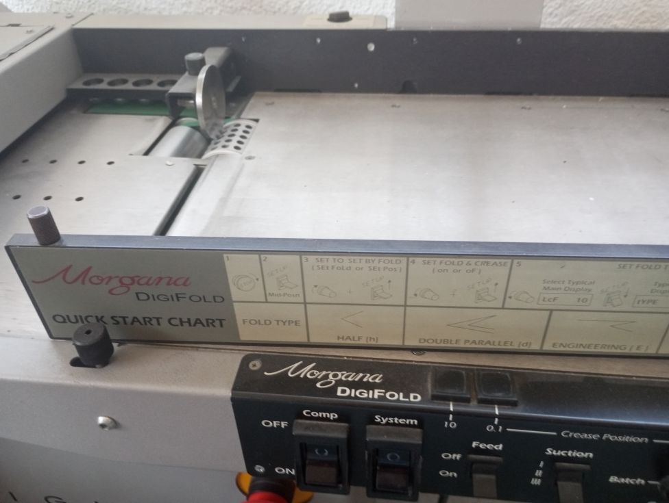 | Detalles | La Morgana DigiFold es una máquina completamente automática, para el hendido y plegado del papel. No provoca ningún arañazo al papel, gracias a su sistema de rodillos y cuchillas de plegado. La Morgana DigiFold está diseñado tanto para el papel impreso en digital o en offset. La DigiFold ha sido uno de los productos más vendidos de Morgana desde que se introdujo por primera vez en 2001. La calidad de la DigiFold en hendidos y plegados, en una sola pasada del papel es insuperable, con una precisión a la decima de milímetro. |