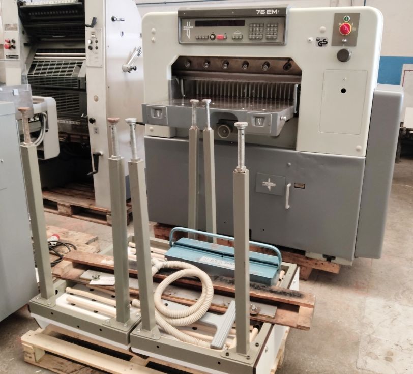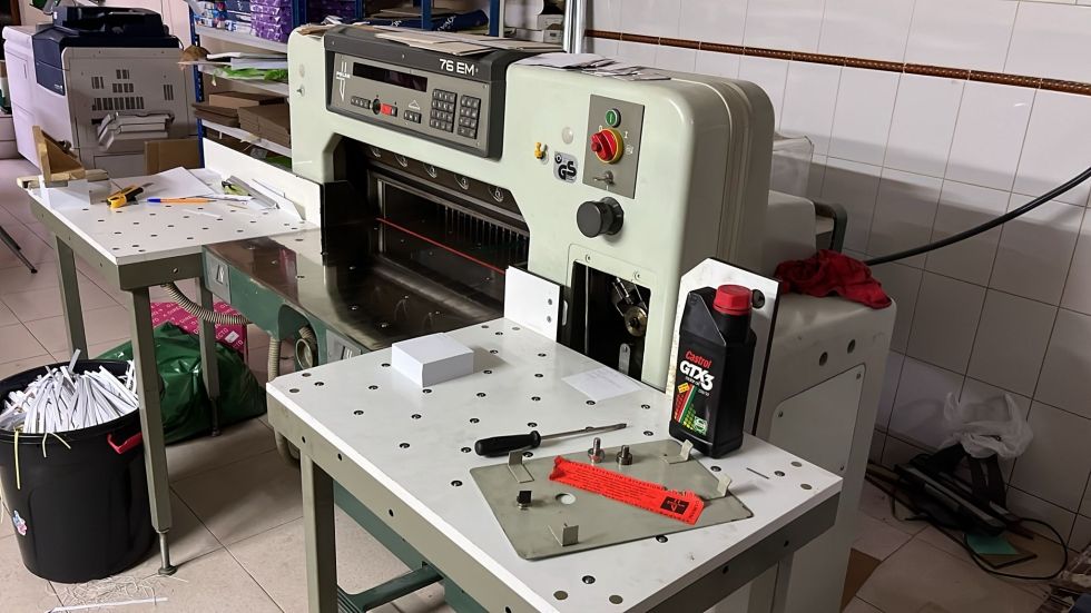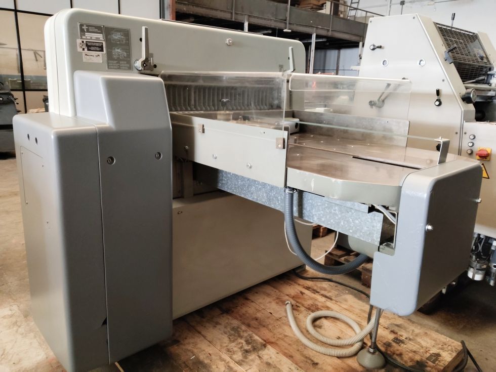 | Detalles | Guillotina 76 cm luz de corte, programas, aire. Mesas laterales, cuchilla de repuesto. Limpia, revisada. Conectada para inspección y pruebas. |