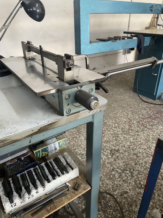 | Detalles | Máquina de doblar con juego de herramientas (11) Altura máxima de fleje de 30mm. 11 parejas de herramientas de diferentes radios. |