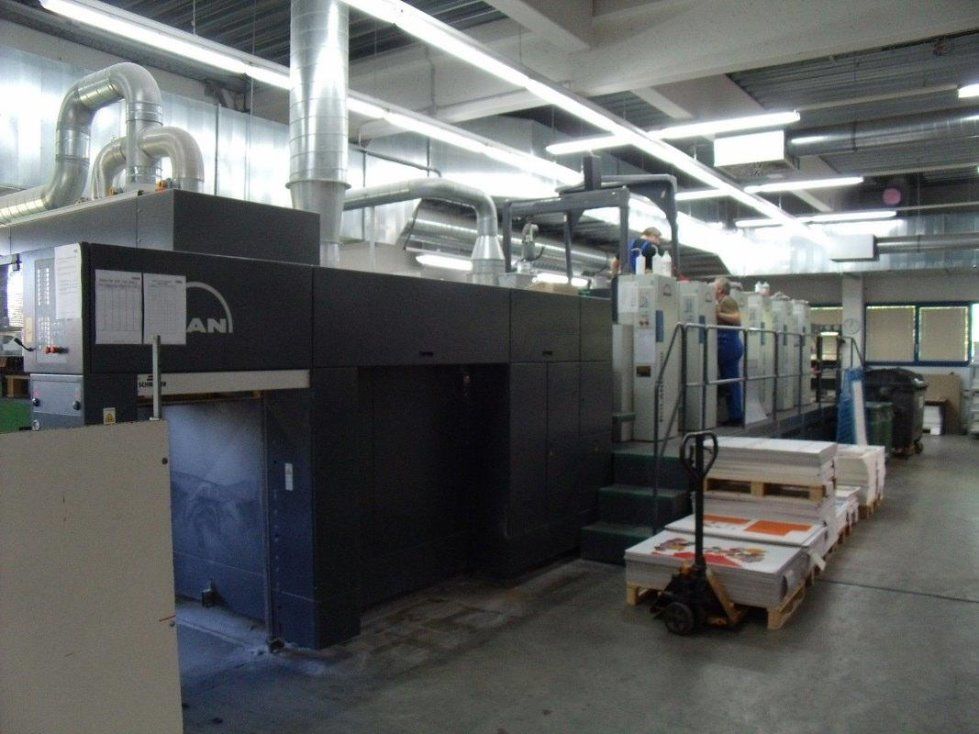 | Detalles | torre de barniz (racleta de cámera) ColorPilot D RCI dispositivo de control de entintado a distancia y teleajuste para los registros circunferencial, lateral y diagonal Roland-Deltamatic grupo mojador con circulación y refrigeración Atemperador de las Baterías APL cambio de planchas automatizado para introducción y extracción de las planchas ajuste automático de los formatos dispositivo de lavado automático de los rodillos entintadores dispositivo de lavado automático de la mantilla mesa de cintas aspiradoras cuerpos impresores individuales con cilindros impresores de doble diámetro superficie de los cilindros portaplanchas, de caucho e impresores de superficie ennoblecida LCS Quick Change Software Quick Change Clamp (coating) Colour contamination TelePresence Comfort Console Package PressLink aplanador de pliegos pulverizador IR-seccador Seccomatic y aire caliente salida de pila alta y prolongada con AirGlide accesorios standard max. 15'000 pliegos / hora |