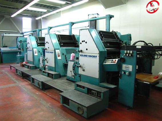 dispositivo de barniz en el 6º cuerpo RCI 2 dispositivo de control de entintado Rolandmatic grupo mojador con circulación y refrigeración 3 tambores de aire mordazas de sujeción rápidas de las planchas sistema de registro pulverizador IR-secador salida de pila alta accesorios standard excelente estado