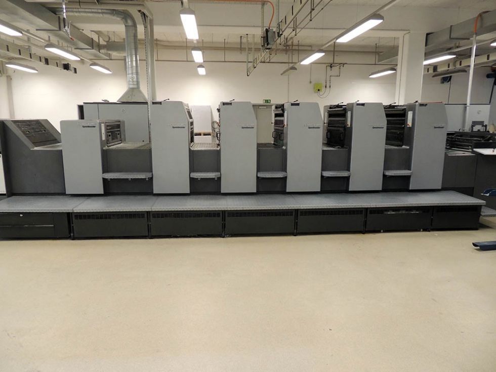 | Detalles | torre de barniz Axis Control CP2000 Consola de Control con telemando para zonas de entintado, velocidad de los rodillos del tintero, los registros circunferencial, lateral y diagonal, con lápiz de luz, Job Memory Card y pantalla táctil ALCOLOR grupo mojador con circulación y refrigeración AUTOPLATE sistema automático de cambio de planchas dispositivo de lavado automático de los rodillos entintadores dispositivo de lavado automático de la mantilla y cilindro impresor pulverizador IR-secador salida de pila alta accesorios standard reversible 2/3, 5/0 |