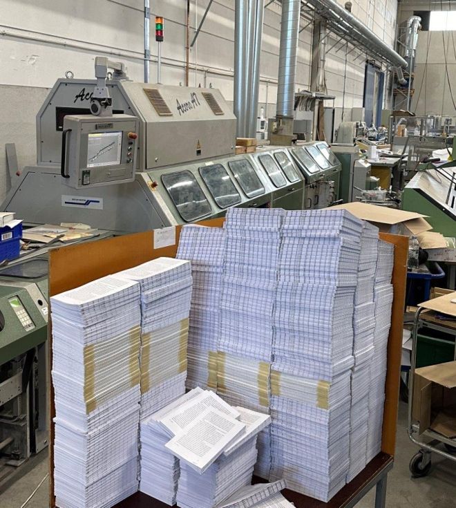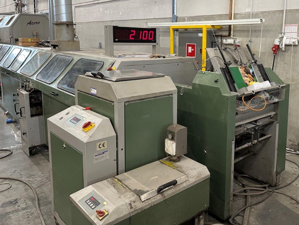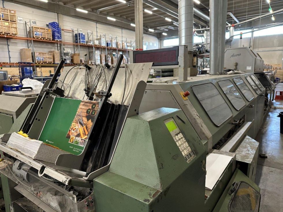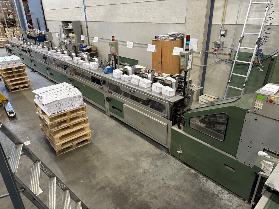 | Detalls | Estación de alimentación manual, 18 estaciones de alzado 1573 (año 2006), ASAC control de calibre autoajustable, Salida de rechazo 3614,Elemento transfer, Acoro A7 22 pinzas, Unidad de encolado del lomo Hotmelt con Premelter, Unidad de encolado lateral Hotmelt con Premelter, Marcador de la cubierta del tambor, 2 estaciones de pinzado, Salida en tejas, Sistema de cintas con 2 Ambaflex torres de secado, Muller Martini Zenith S trilateral, Muller Martini CB16 apilador compensador |