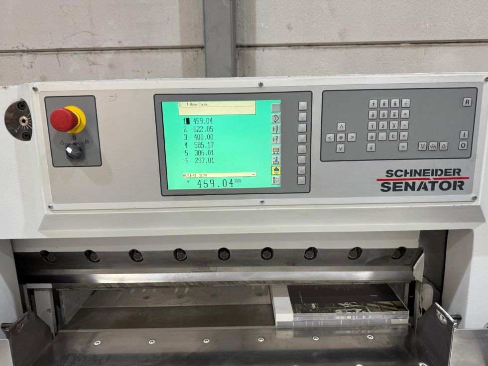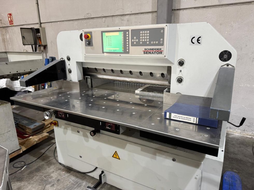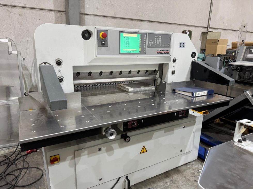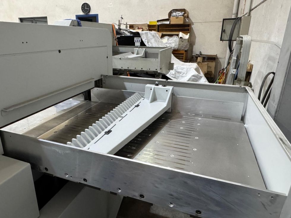 | Detalls | Advanced programmer Central air table Side tables with air Photocells CE Hydraulic drive of the pressure beam with fully adjustable force Cutting line Rear table cover opens for easy cleaning of the machine Spare knife Chrome table surface anti rust Cutting sticks, operating tools, paper tapping block, documentation. Technical data: Working width 920mm Stack height 120mm Weight 1720 kg 380V power supply Complete cleaned, checked and tested In full working conditions |