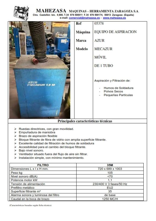 | Details | Móvil, de 1 tubo, aspiración y filtración de humos de soldadura, polvos secos y pequeñas partículas, con prefiltro metálico, superficie filtrante 35 m2 |