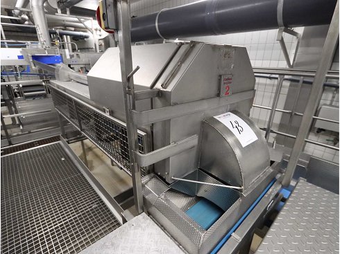 Diámetro de la navaja aproximadamente 400 mm, equipada con cinta transportadora, longitud de aproximadamente 3000 mm, en estructura de acero inoxidable 3100x650x900 mm, 1,5 kW, incluyendo 2 cuchillas de repuesto, sin plataforma ni suelo de rejilla |