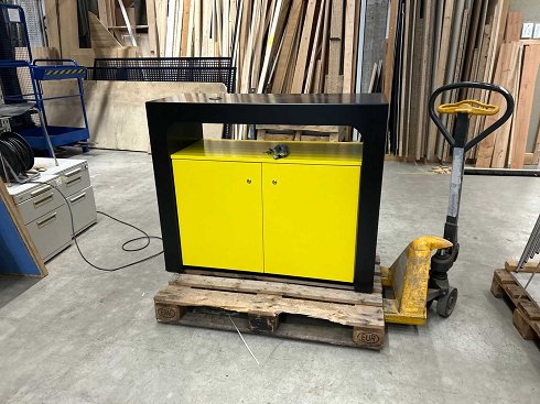 Contraamarillo negro con dos puertas cerrables, en embalaje de transporte, de cuatro vías que puede ser conducido por debajo con un transpalet, dimensiones del embalaje: longitud 1,35 m, anchura 65 cm, 1,20 m. Palé a cambio, sin transpaleta |